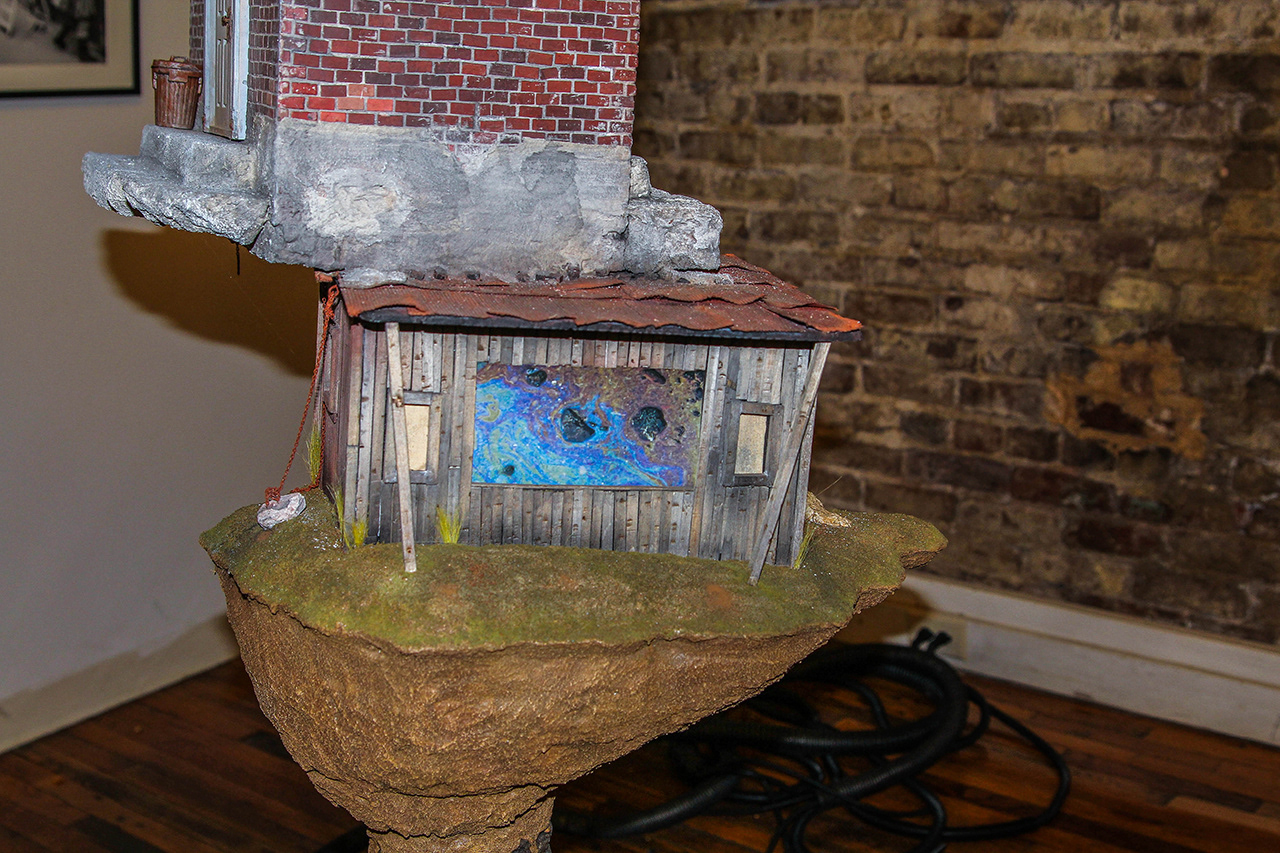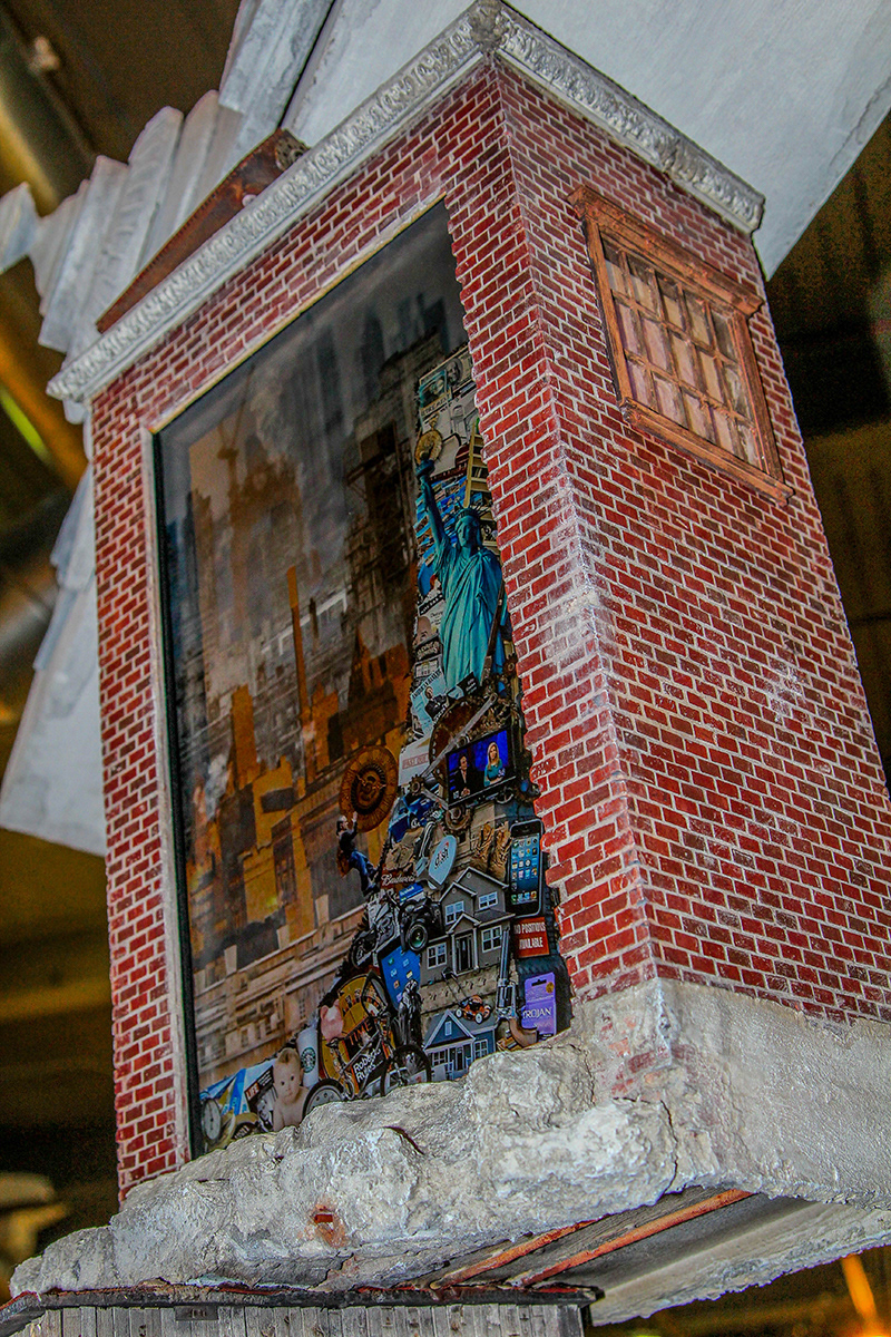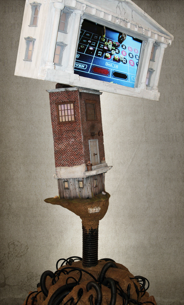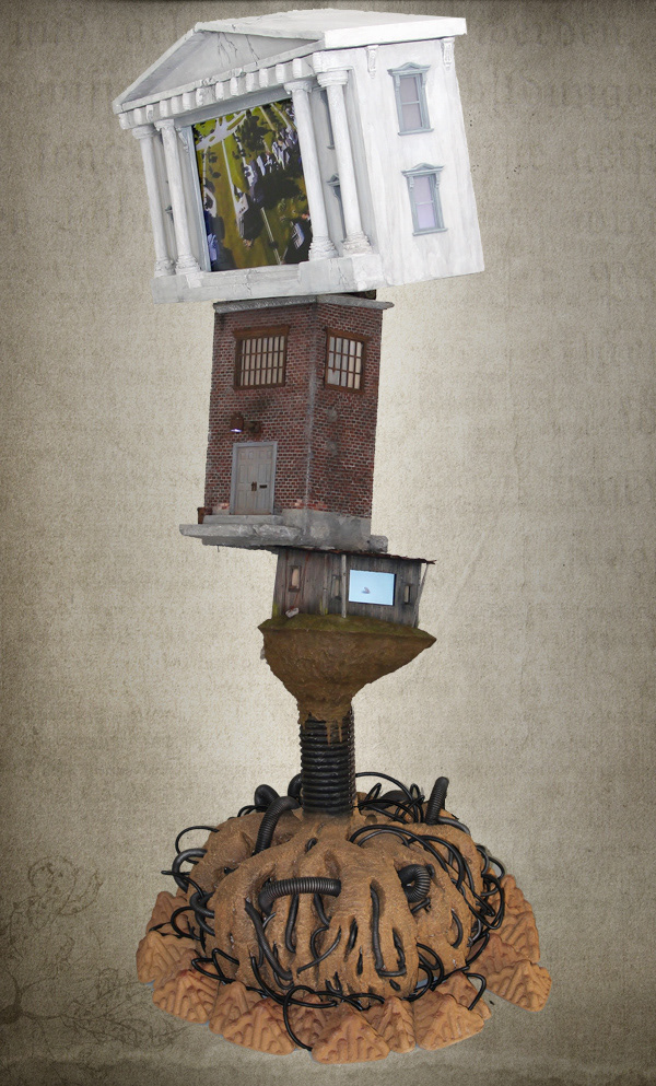 “Layer Cake, a new Tower of Babel” is a Multimedia Sculpture. In my work I use meticulously detailed structures containing video and animated imagery to engage the viewer from an artistic and civic perspective about the human condition. “Layer Cake” challenges an observer’s expectations, beliefs and assumptions through visual representations of information independent from typical associations and attributes. Through challenging the common perceptual outlets in the form of sculpture the symbolic can be used to convey unexpected messages.