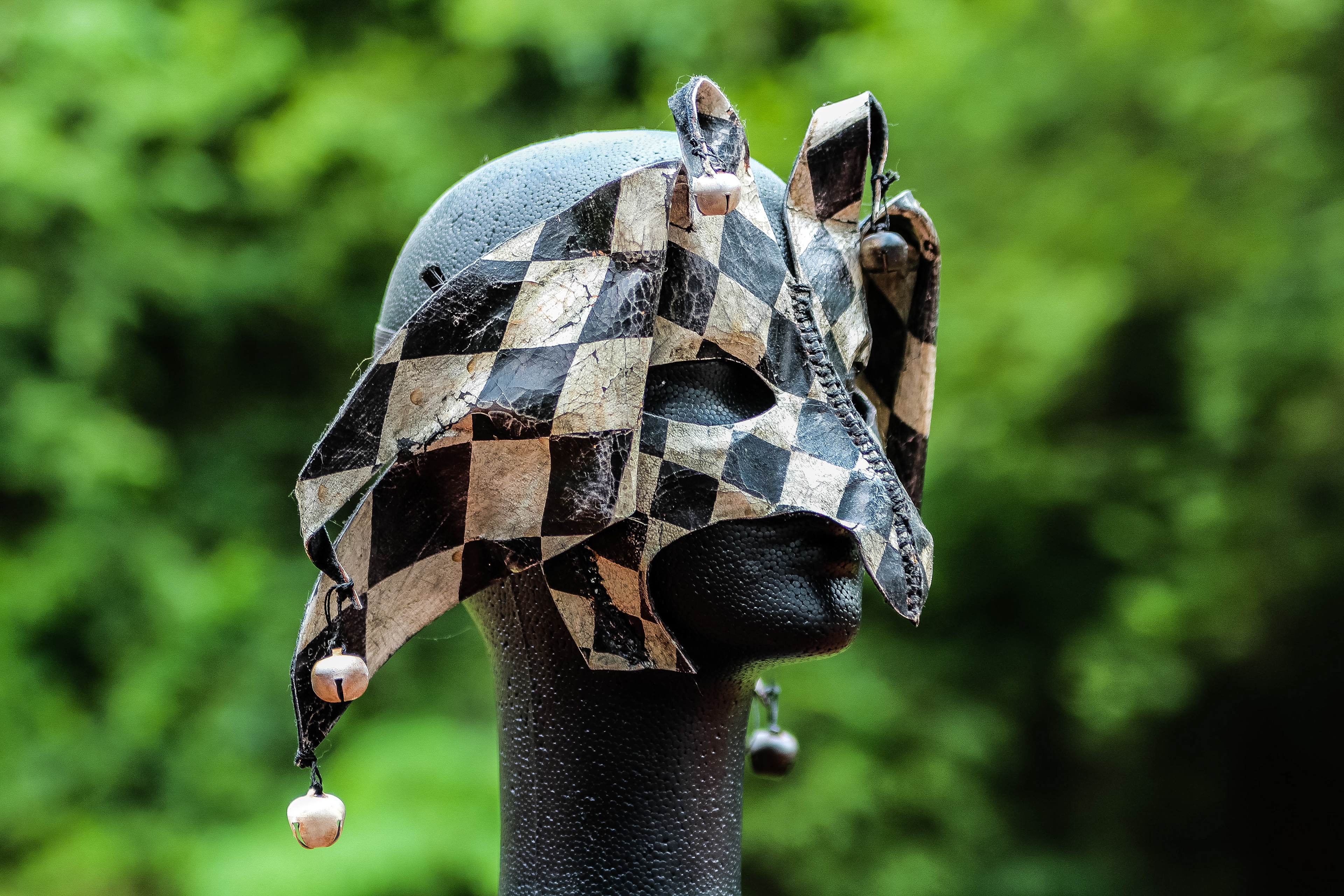 Leather Jester Mask (Leather, Dye, and Waxed Leather Thread).