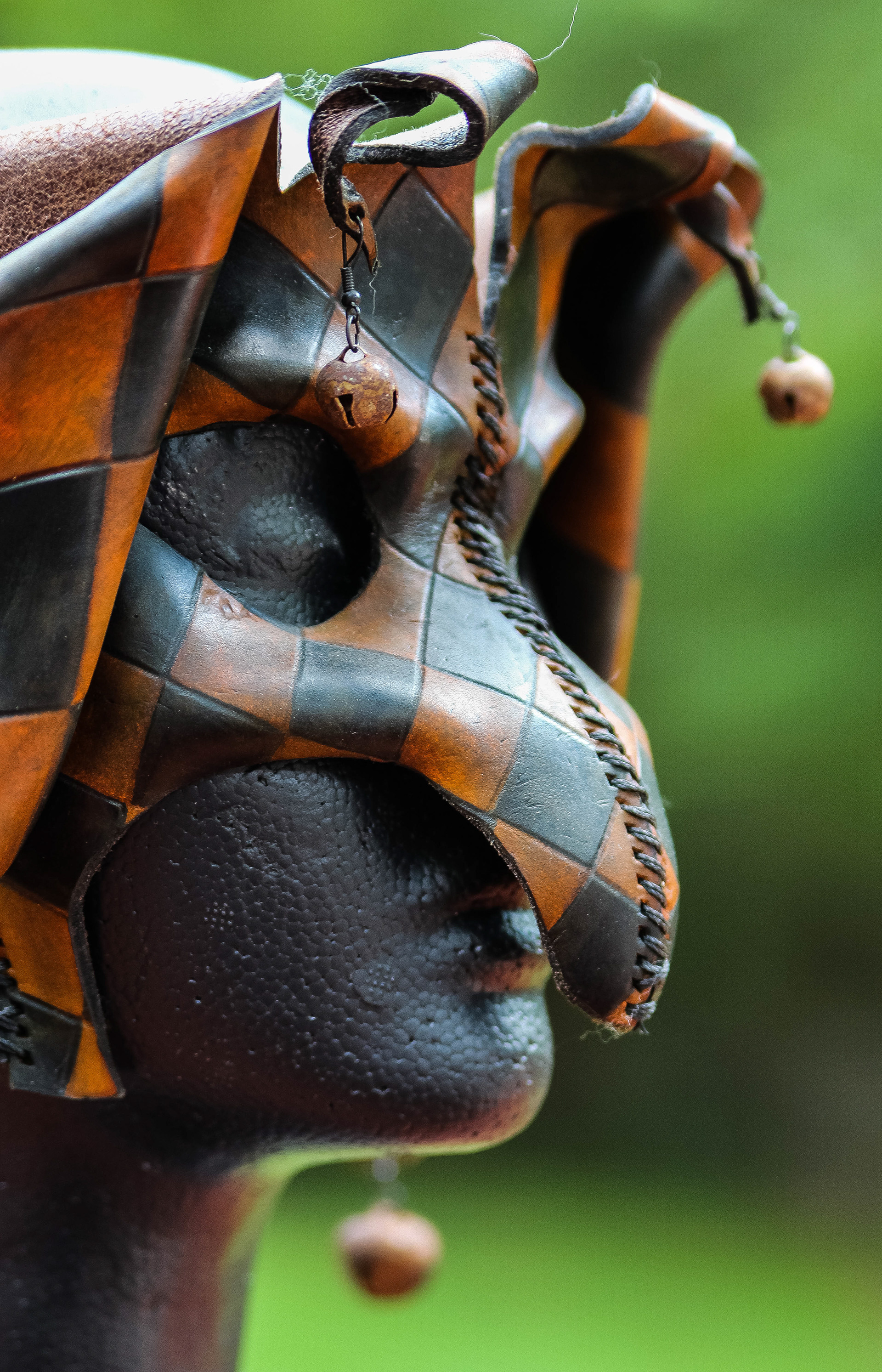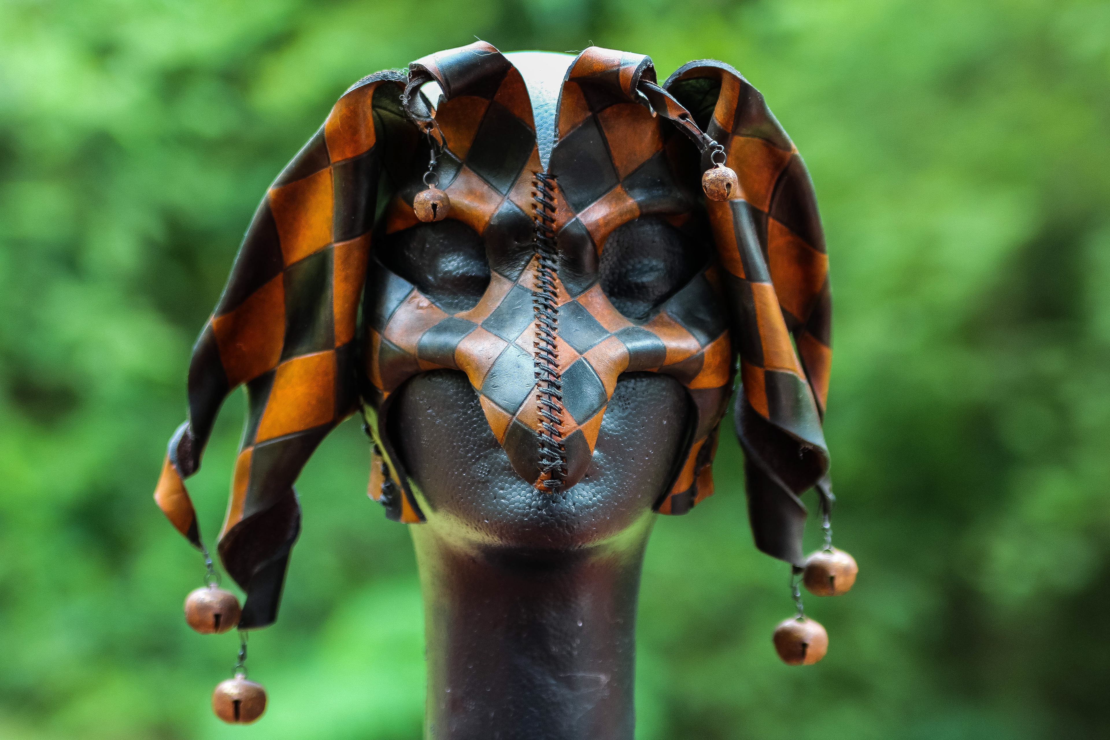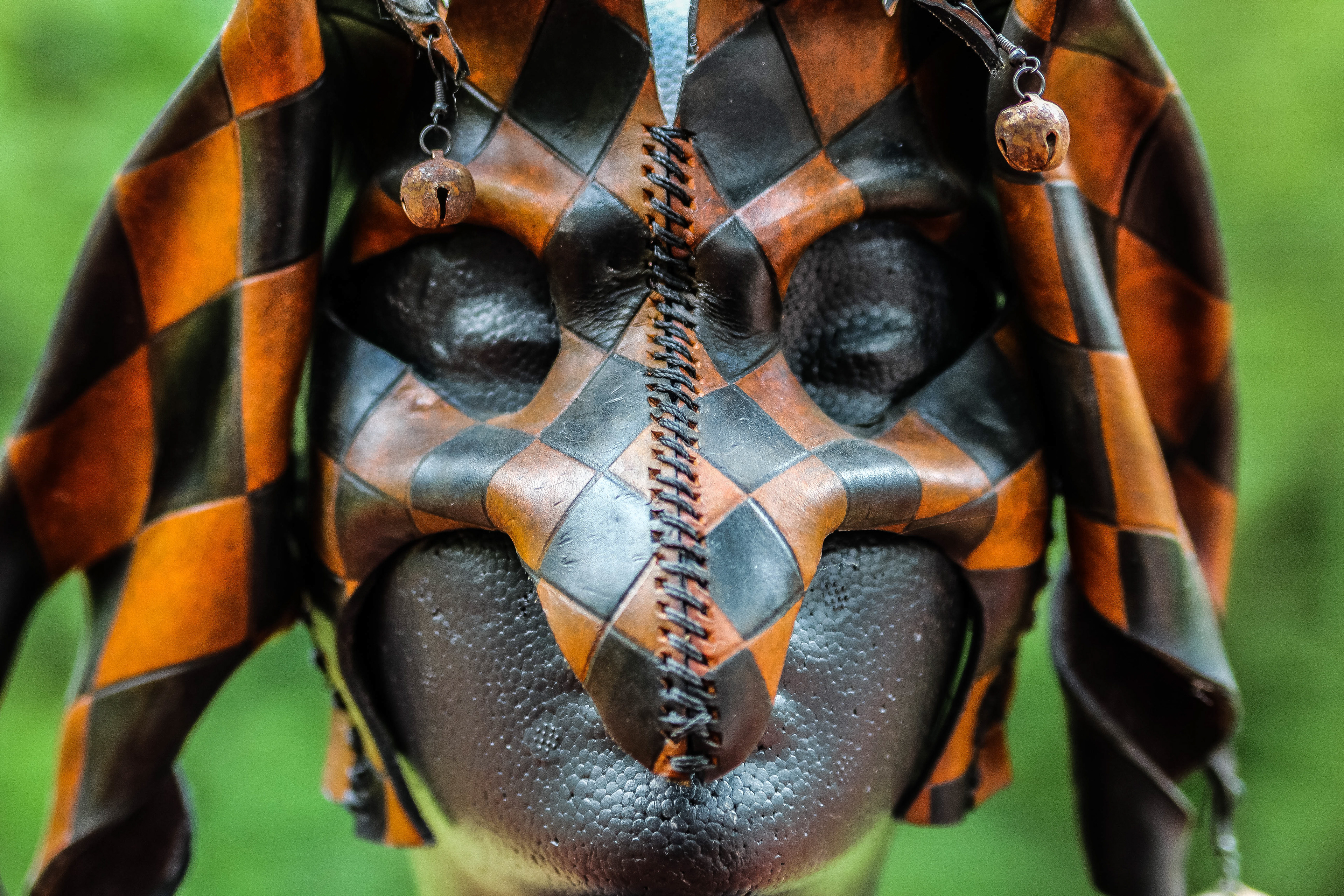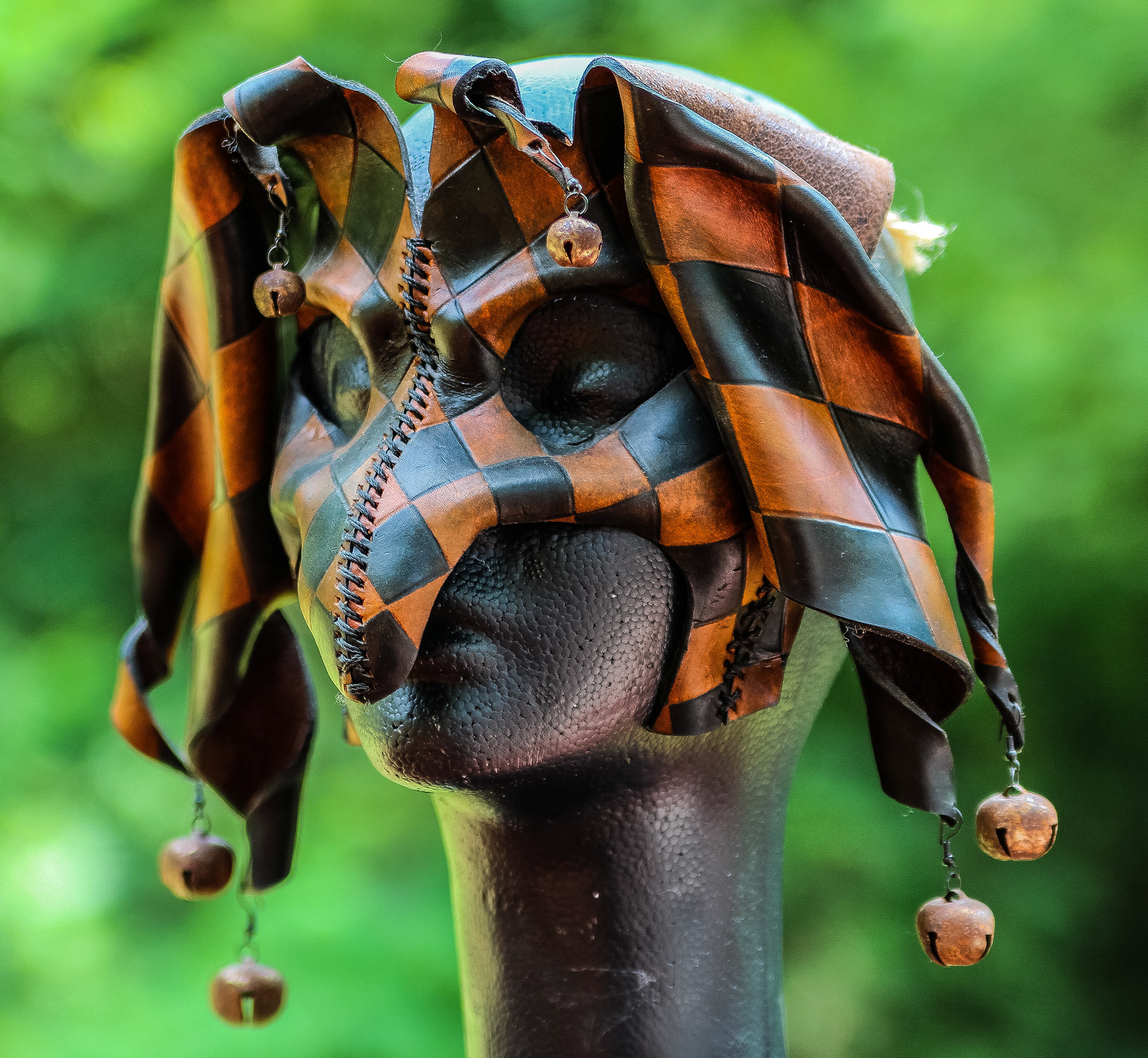 Leather Jester Mask (Leather, Dye, and Waxed Leather Thread).