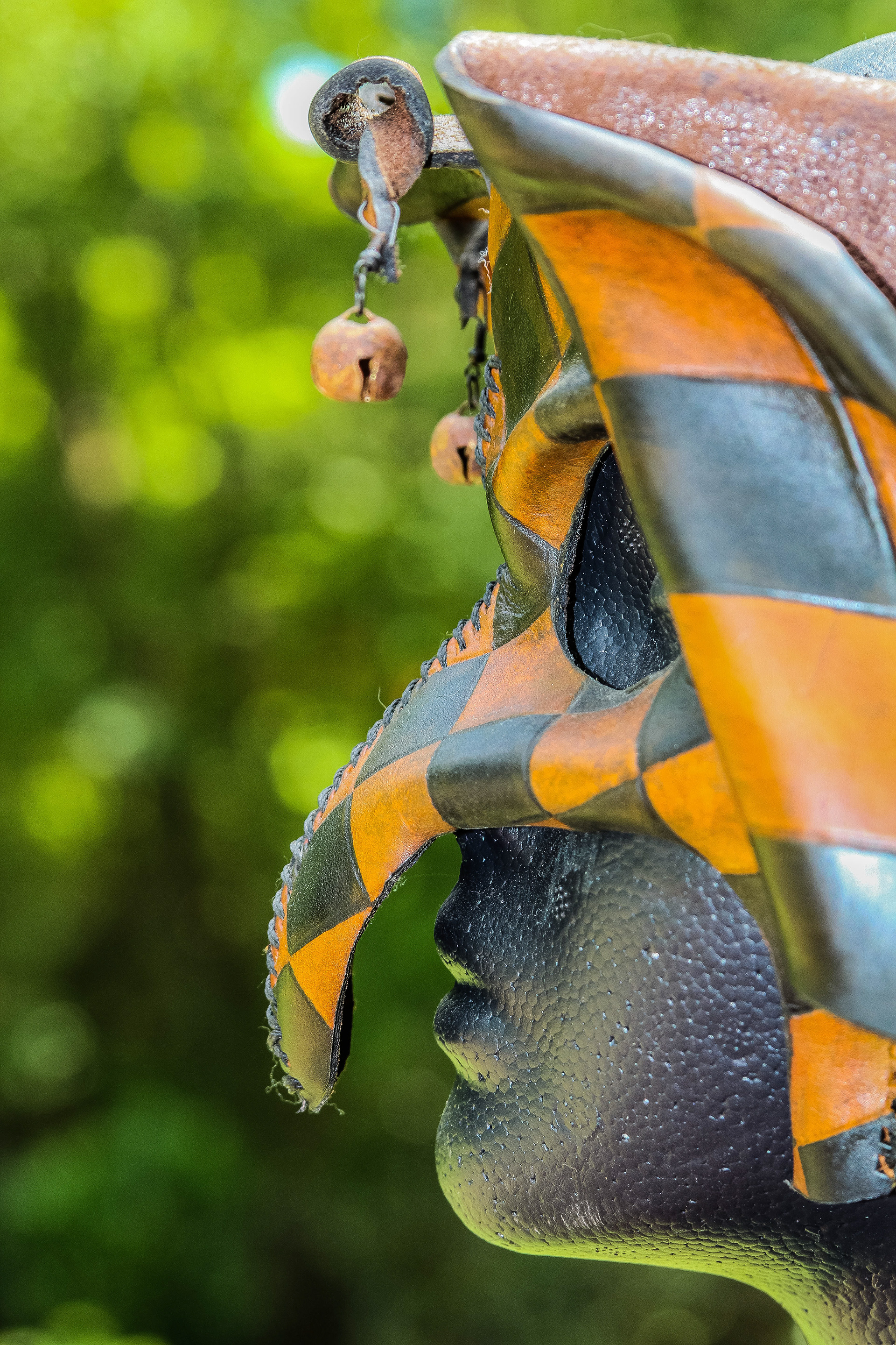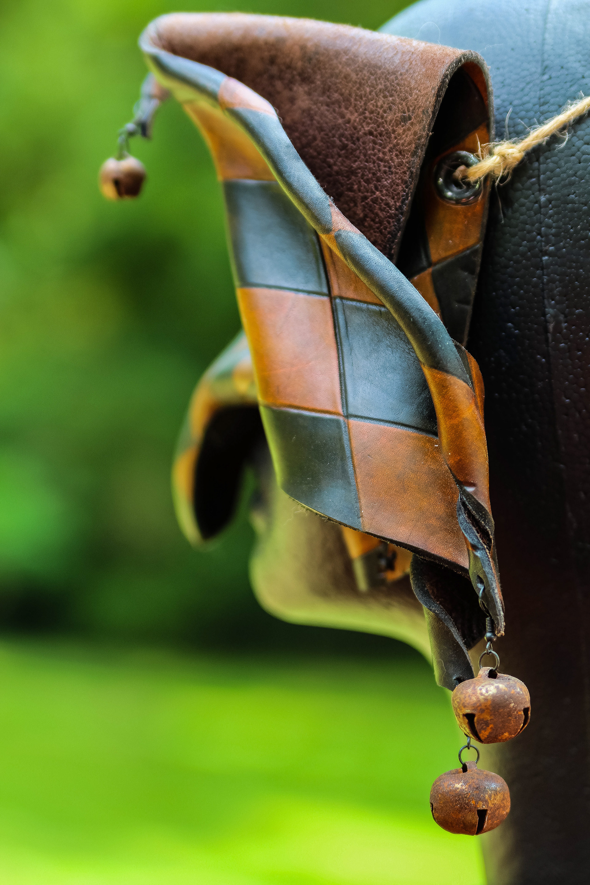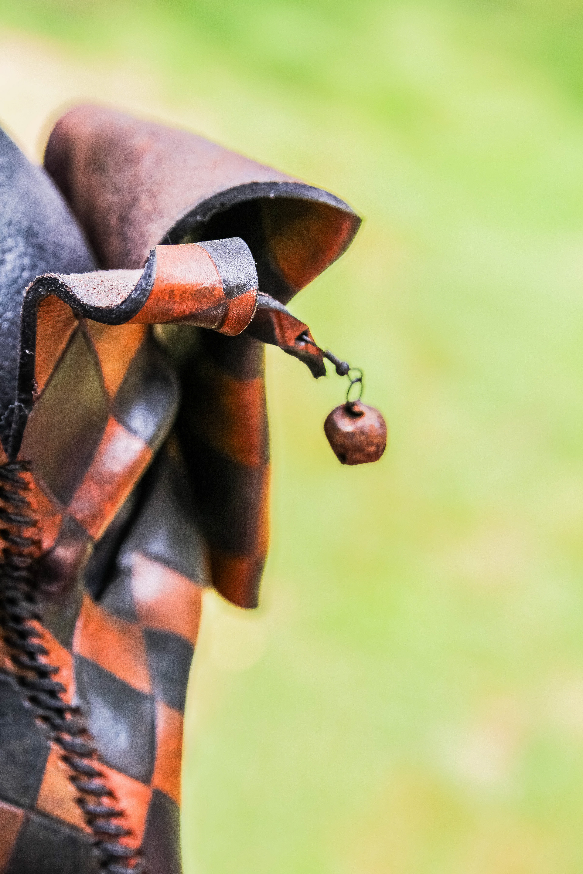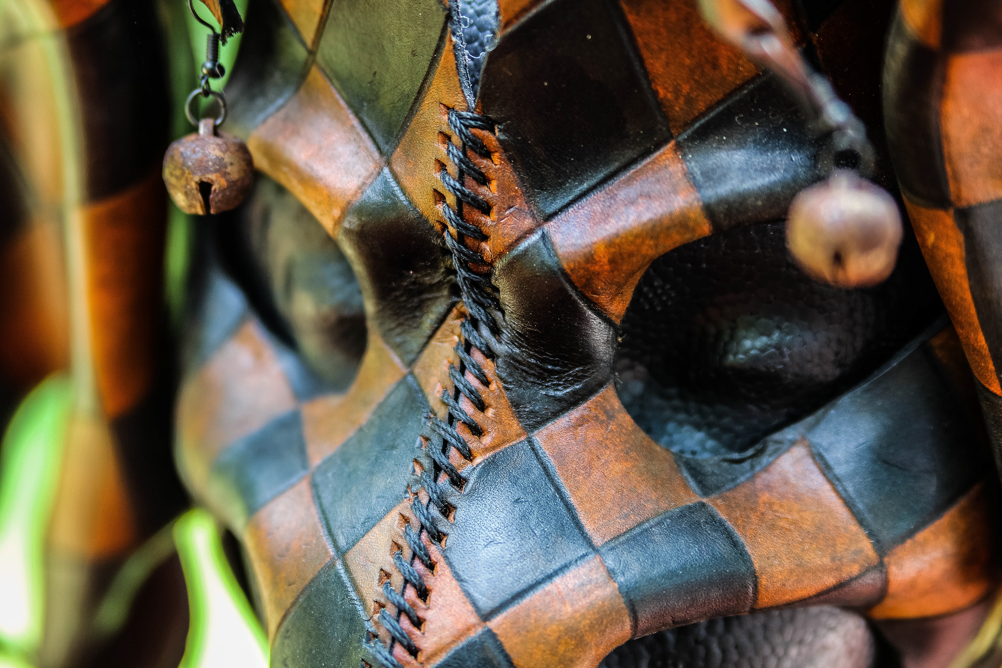Leather Jester Mask (Leather, Dye, and Waxed Leather Thread).