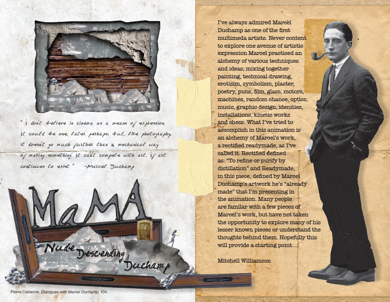 Animation about Marcel Duchamp and his artwork. Presented in a CD/DVD case that contains a Blu-Ray disc and a folded informational booklet. Personal project. 16 minutes. After Effects, inDesign, Photoshop, & Illustrator