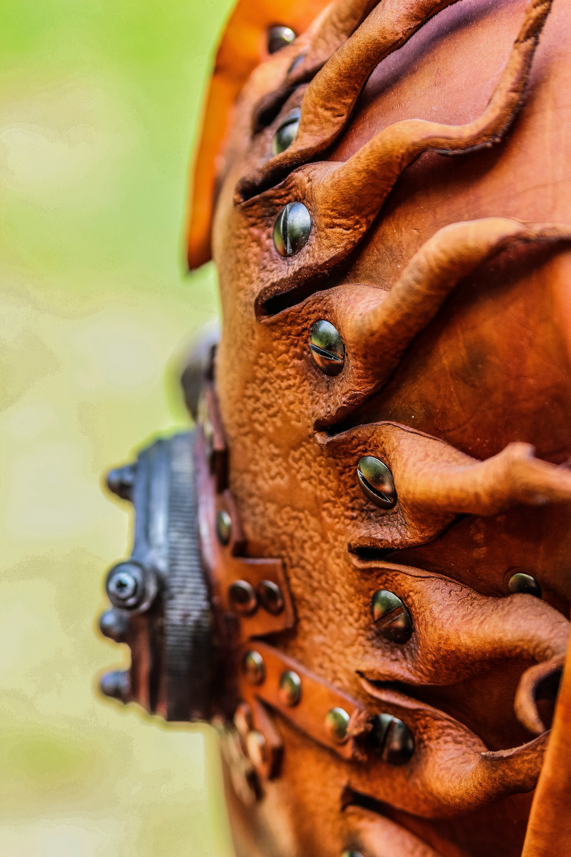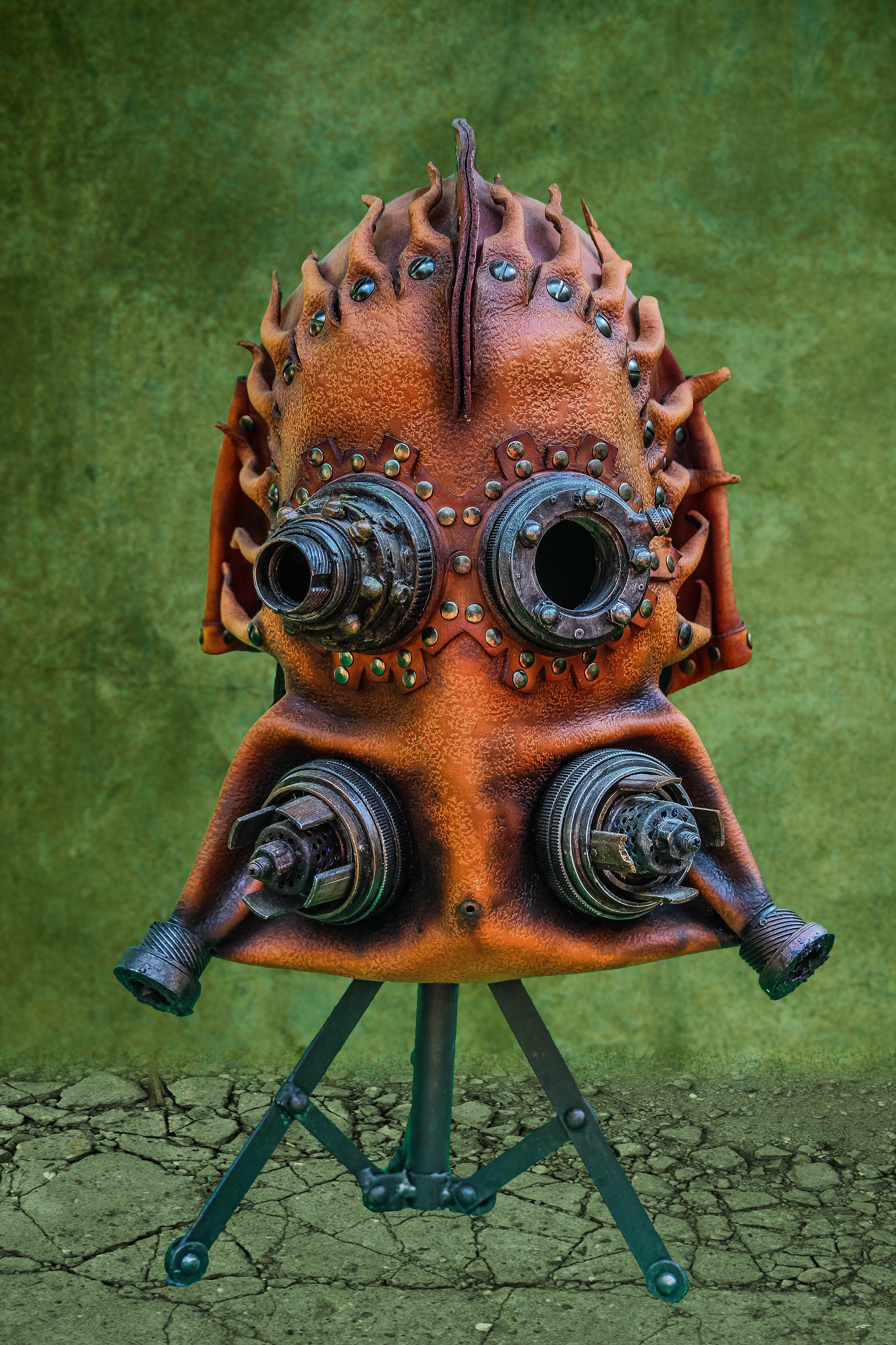 Leather Steampunk Mask (Leather, Dyes, Rivets, Cast Urethane Plastic, Waxed Leather Thread, and EL Wire with Battery Pack).