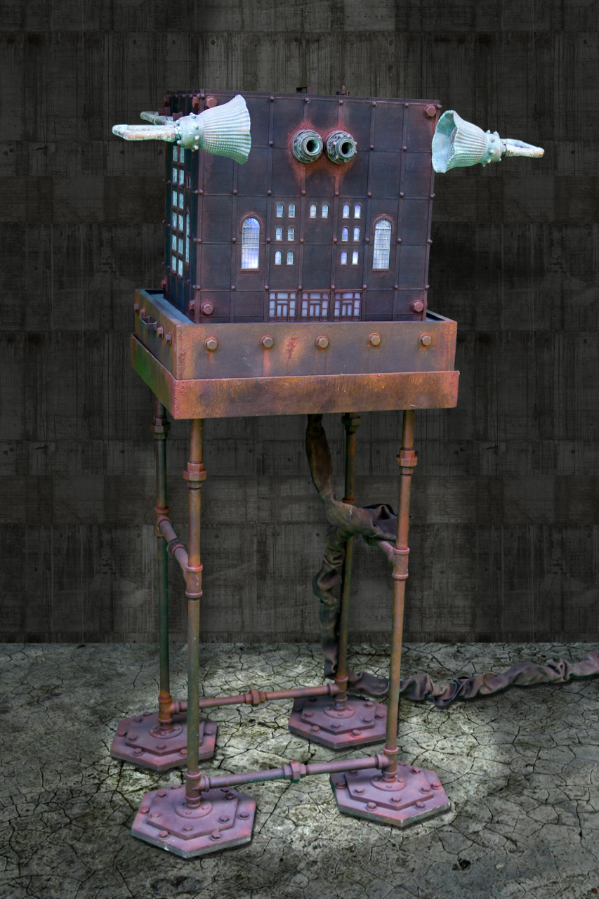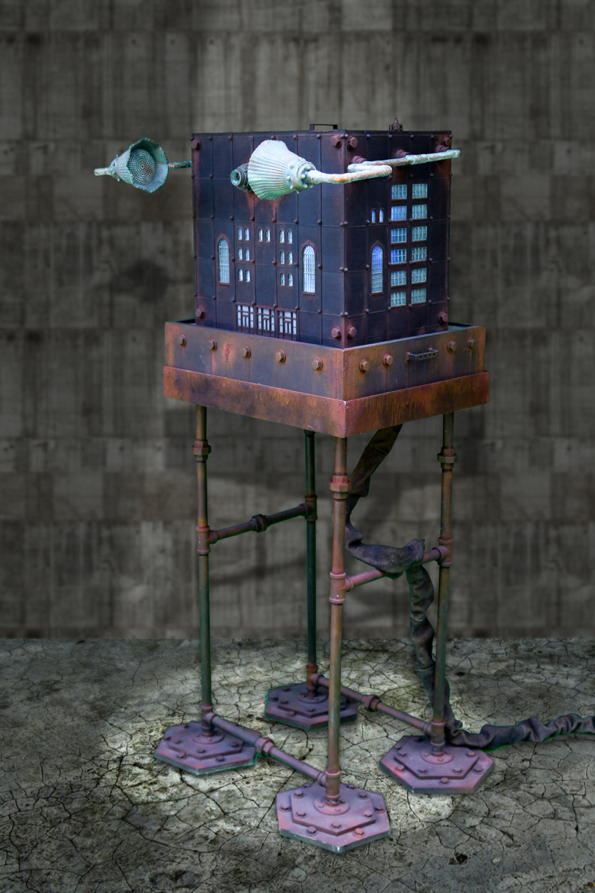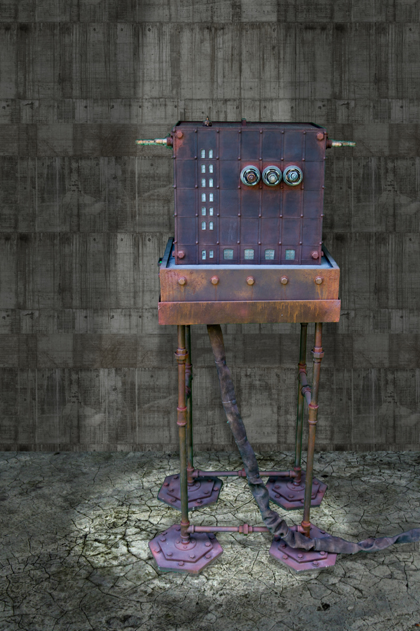 A Personalized Political Indoctrination Device. Multimedia sculpture includes video animation with audio taken from radio and TV recordings of political media figures. With any new animation and recording the sculpture becomes an entirely new piece.