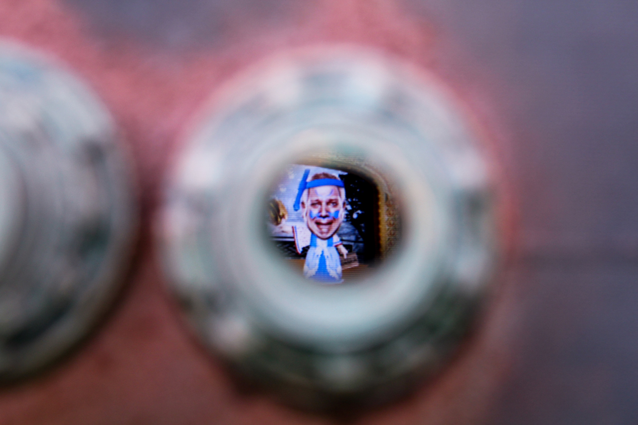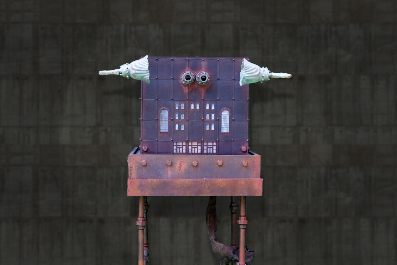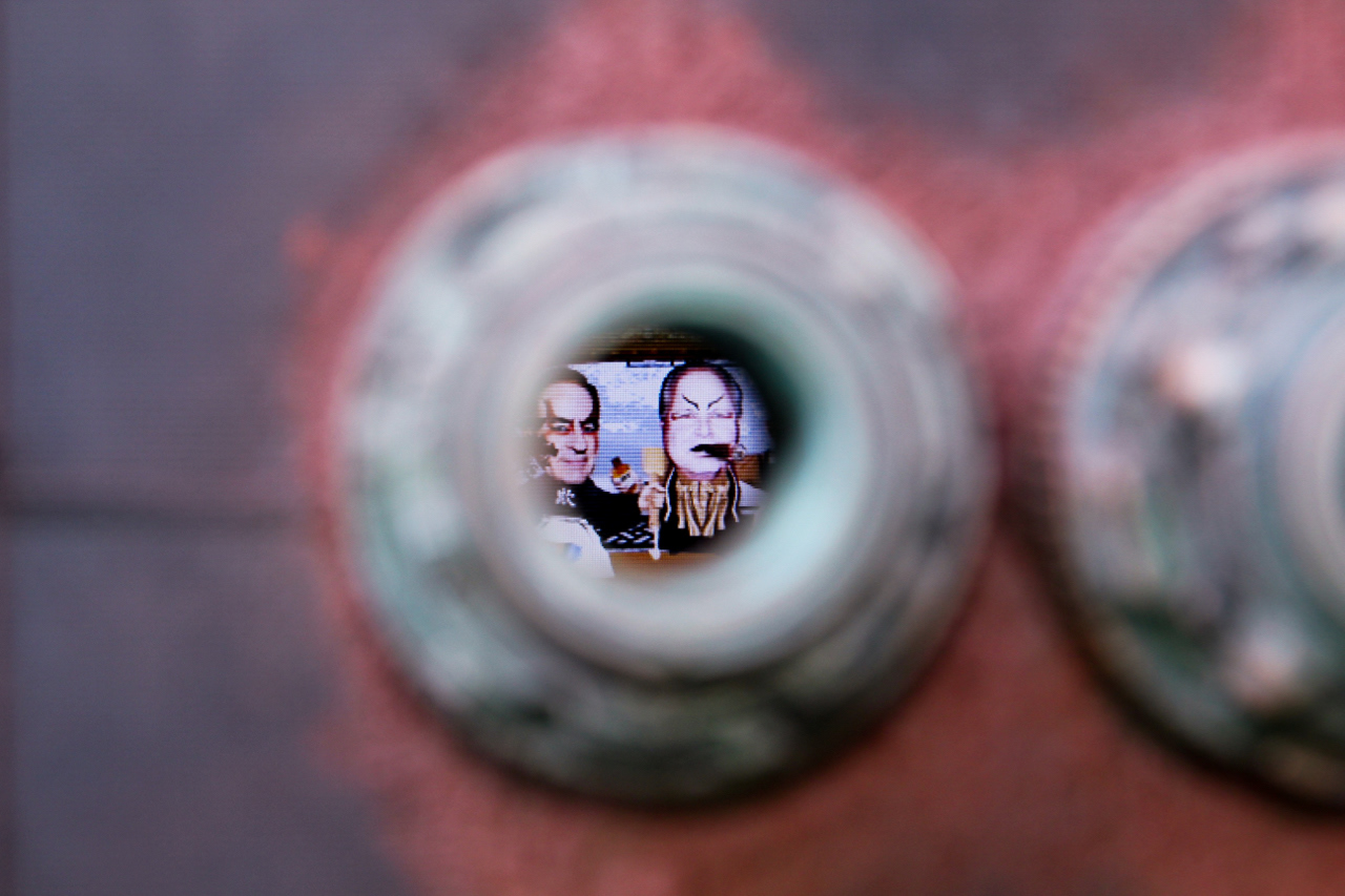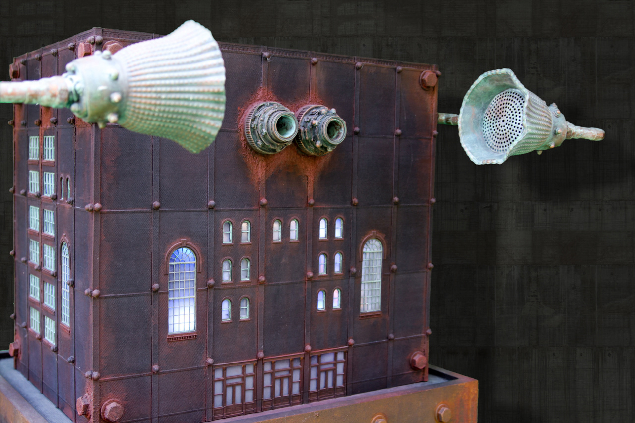 A Personalized Political Indoctrination Device. Multimedia sculpture includes video animation with audio taken from radio and TV recordings of political media figures. With any new animation and recording the sculpture becomes an entirely new piece.